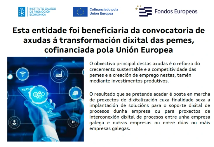 Esta entidade foi beneficiaria da convocatoria de axudas á transformación dixital das pemes, cofinanciada pola Unión Europea